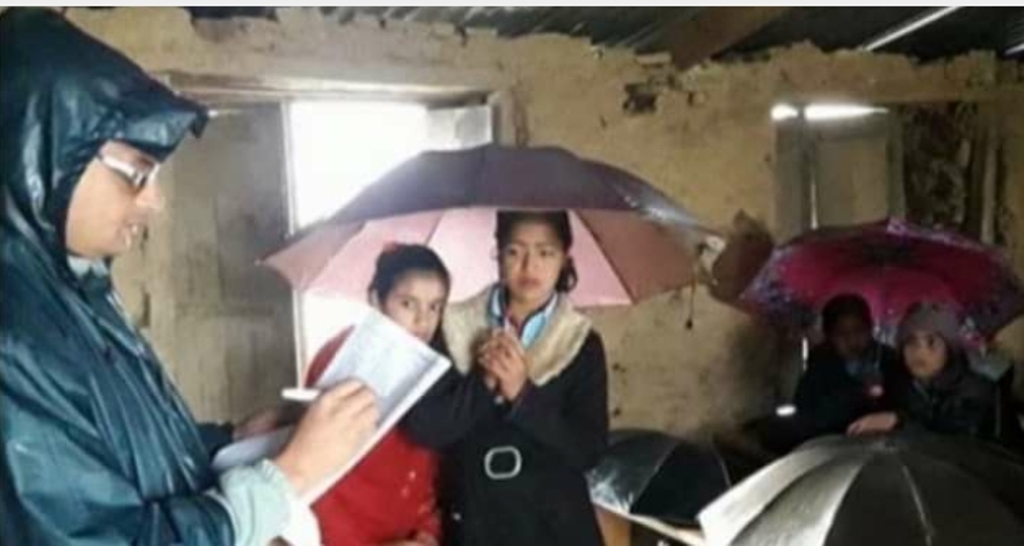 दैलेख । छानोबाट पानी चुहिरहेको कक्षा कोठा–रेनकोट लगाएर पढाउँदै गरेका शिक्षक, अनि छाता ओढेर पढ्न बाध्य बिद्यार्थी । यो दृश्य दैलेखको गुराँस गाँउपालिक...